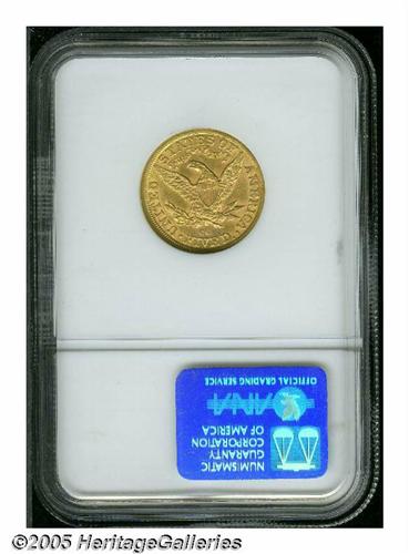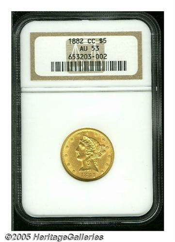 <B>1882-CC<$5> AU53 NGC.</B></I> A honey-gold piece that exhibits a pleasing band of bright luster throughout the borders. A better Carson City issue, quite rare in Uncirculated grades. Struck from clashed dies.