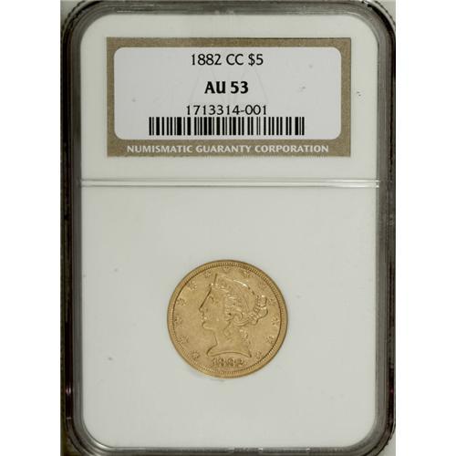 <B>1882-CC $5 AU53 NGC.</B></I> Well struck and showing light, even highpoint wear commensurate with the grade on both sides. Attractive reddish-tan coloration is noted, along with a few small abrasions.<BR><BR><b>Shipping:</b> Coin/Currency (<a target="_blank" href="http://www.heritageauctions.com/common/shipping.php">view shipping information</a>)