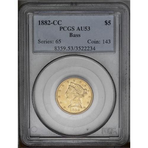 <B>1882-CC $5 AU53 PCGS.</B></I> Ex: Bass. The strike is not quite full in the centers, but honey-gold color emerges from the margins and devices. Contact marks are surprisingly few in number. A charming Carson City Half Eagle. Likely originated as part of lot 1185 in Part Two of the Harry W. Bass, Jr. Collection, held 10/99 by Bowers and Merena.