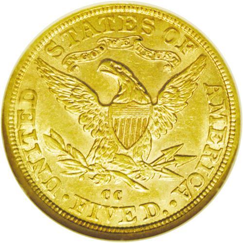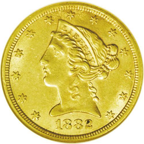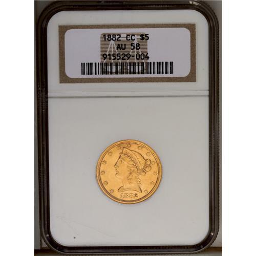 <B>1882-CC<$5> AU58 NGC.</B></I> One of the more commonly encountered circulated CC half eagles, although it grows increasingly scarce in AU conditions, Mint State examples are considered rare. The true scarcity is confirmed by the Population Reports; both PCGS and NGC combined have certified only 38 Uncirculated examples with an unknown number of these likely being resubmissions. It is safe to say that for most collectors, an AU specimen is the best that can be hoped for.<BR> This is a solidly struck coin with satiny surfaces that have retained much original luster, although it is slightly muted. This coin is largely unimpaired by marks, the only mentionable one is located in the left obverse field near Liberty's nose. This level of quality always suggests an opportunity for the astute bidder.