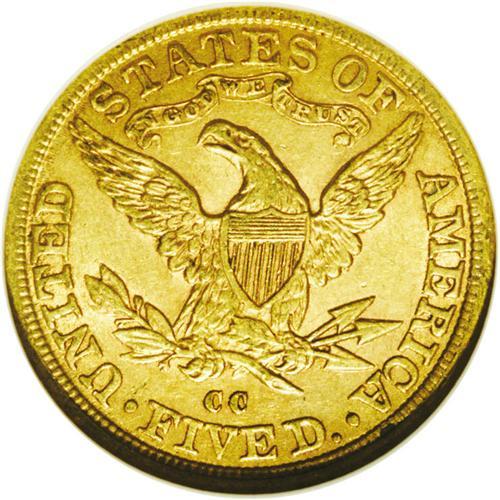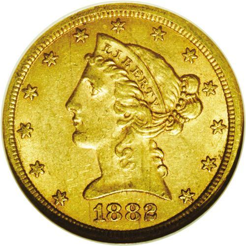 <B>1882-CC<$5> AU58 NGC.</B></I> The '82-CC is the most common Carson City half eagle prior to 1891, and as such has proven to be a popular choice for many type sets over the years. This specimen displays deep honey-gold patination overlying soft luster in the recesses, and exhibits well defined motifs. Considerable detail remains on the design elements, though the eagle's neck feathers are soft.