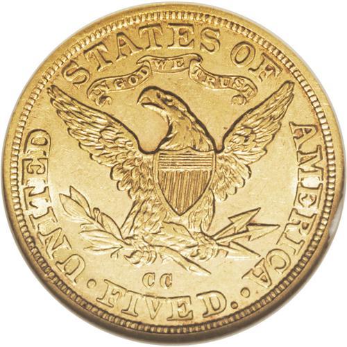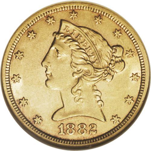 <B>1882-CC $5 AU58 NGC.</B></I> The availability of the 1882-CC five dollar in AU makes it a logical choice for type collectors. Only light friction is seen on this piece over the surfaces, and significant amounts of luster remain around the devices. A bit softly struck over the highpoints with even orange-gold color.<BR><BR><b>Shipping:</b> Coin/Currency (<a target="_blank" href="http://www.heritageauctions.com/common/shipping.php">view shipping information</a>)