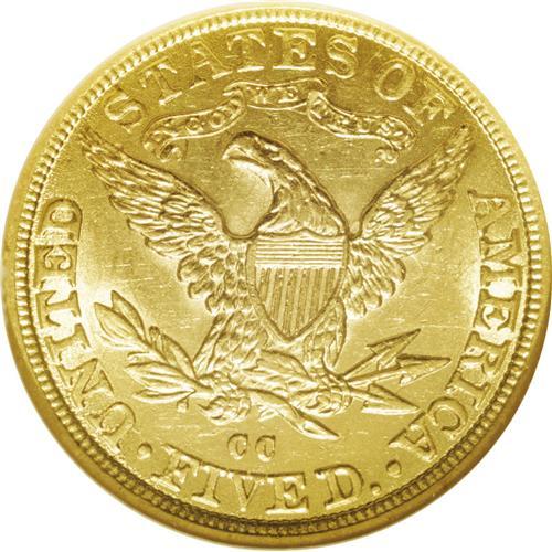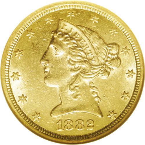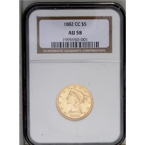 <B>1882-CC<$5> AU58 NGC.</B></I> Variety 1-A. Shimmering luster illuminates the borders of this yellow-gold Carson City half eagle. A faint pinscratch is barely worthy of notice below Liberty's chin. Struck from lightly clashed dies. A scarce date, as just 82,817 pieces were produced. Nearly unobtainable in Uncirculated grades, most collectors instead choose a lightly circulated example.