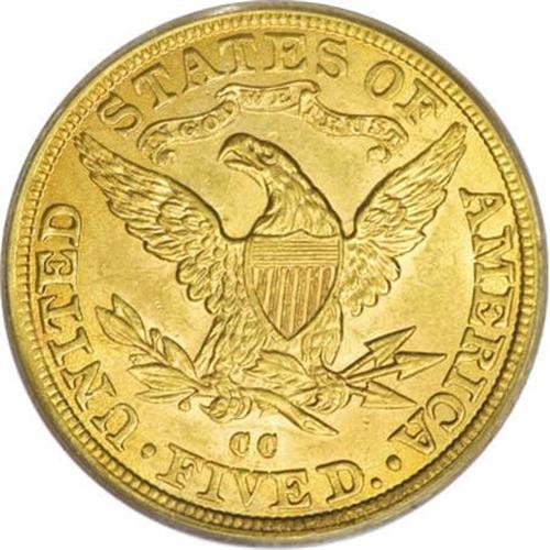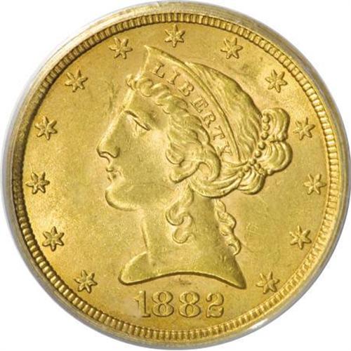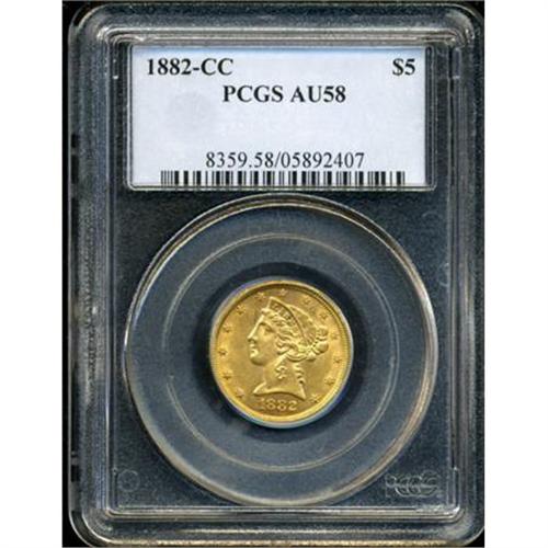 <B>1882-CC $5 AU58 PCGS.</B></I> An important issue in the lineup of Carson City Mint half eagles, from a mintage of 82,817 pieces, most entering circulation at the time of coinage, as evidenced by the considerable population of circulated pieces and the rarity of Mint State coins. This borderline example, with nearly full frosty luster and brilliant yellow surfaces, has only a slight trace of rub on the highpoints, perhaps due more to inappropriate handling rather than actual circulation.<BR><BR><B>Coin Engraver:</B> Christian Gobrecht<BR><BR><b>Shipping:</b> Coins & Currency (<a target="_blank" href="http://www.heritageauctions.com/common/shipping.php">view shipping information</a>)