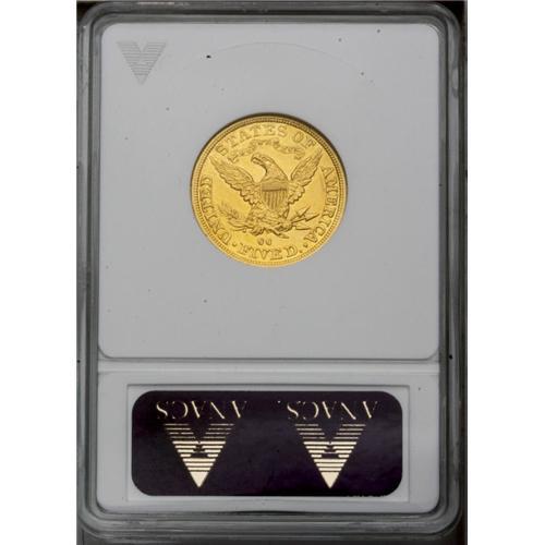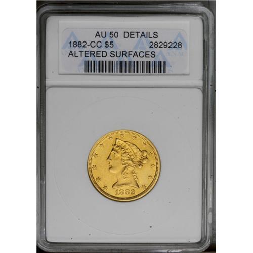 <B>1882-CC<$5>--Altered Surfaces--ANACS. AU50 Details.</B></I> Orange-gold surfaces display micro-porosity, especially on the obverse, and a shallow scrape is visible below AM of AMERICA. The design elements are nicely defined throughout. <BR><BR><B>Important notice:</B> Heritage usually auctions material at the rate of 200-250 lots per hour. On some occasions eBay Live bid software or the Internet may not be able to keep up with the pace of the auction. We recommend placing a realistic absentee bid now as insurance to avoid disappointment. Occasionally the auctioneer may eliminate or reject an eBay Live bid, and the auctioneer may also reopen a lot after the close of the eBay live bidding (usually because we missed an audience bid), and may reject your bid even if it shows you as the winning bidder. By bidding via eBay Live, you agree that Heritage may award the lot to another bidder at its sole discretion under the circumstances described above or any other reasonable circumstances. Since eBay bids are not shown to us until we open the lot on the floor, we treat those bids just like floor bids. In most cases the floor responds before the eBay bid is presented to us, due to Internet lag time, so for consistency we have made it a policy that floor bids are always considered first over tie eBay live bids. Also please note that all Heritage lots purchased through eBay Live carry a 20% Buyer's Premium. Please make sure you read the Terms and Conditions before you bid. This lot is being auctioned in conjunction with a live floor auction by Heritage Galleries & Auctioneers. All final auction and invoice information will be supplied by Heritage Galleries & Auctioneers, and all other information should be considered preliminary. Lot:2806 <BR><BR><B>Winning Notification and Billing:</B> After the FINAL session in this auction is complete, Heritage will send e-mail and snail mail invoices. This process normally takes several days. All final auction and invoice information will be supplied by Heritage Galleries & Auctioneers, and all other information should be considered preliminary. <BR><BR>This auction will be conducted on a live auction floor and over the Internet through eBay Live. If you choose to place an absentee bid, please take a moment to <font color='#0000ff'><u><a href='http://pages.ebay.com/liveauctions/help/before/laabsentee.html'>learn how eBay Live absentee bidding works</a></u></font><font color='#000000'>