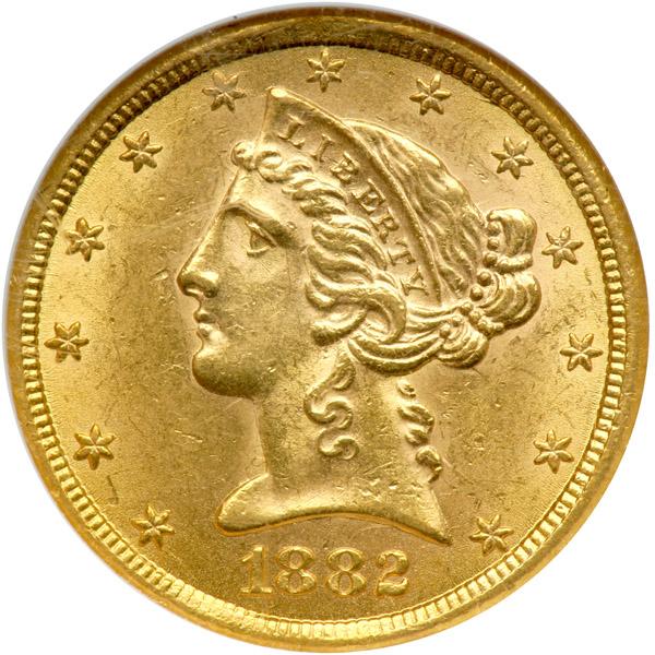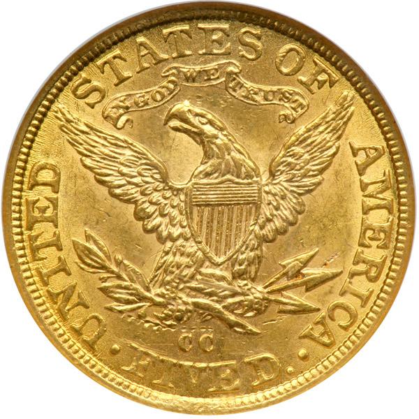 1882-CC. NGC graded MS-61. Well struck and untoned. Only 82,817 struck. A nicely frosty coin that retains the desirable mint bloom which is so often lacking from this series. The surfaces are about par for the grade with minor signs of handling or scuffs to the luster. Sharp as nearly always seen, with no signs of striking softness on the devices. Coinage for the year came to a halt after a fairly substantial eighty-two thousand were struck, virtually all of which crossed the threshold into circulation. A few were set aside, how or why no one knows, including the present MS61 to delight the senses and draw attention from the specialists of the Half Eagle or Carson City series. Pop 20; 8 finer (PCGS # 8359) .