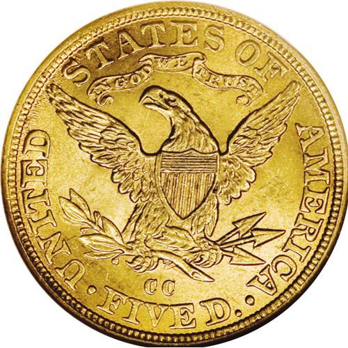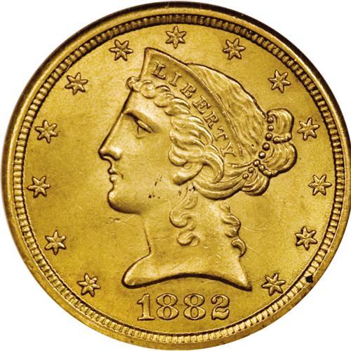 <B>1882-CC $5 MS62 NGC.</B></I> Satin honey-gold luster is present on the obverse of this sharply detailed Mint State piece with similarly toned mint frost on the reverse. A few tiny spots and surface marks are consistent with the grade. This piece has exceptional aesthetic appeal, and it ranks among the finest known examples from a mintage of 82,817 coins. Nearly all pieces coined in 1882 must have entered circulation, as Mint State pieces at any numerical level are not often encountered. The total population of this issue by NGC and PCGS combined is just 11 coins graded MS62, with none finer. Census: 7 in 62, 0 finer (4/07).<BR><BR><b>Shipping:</b> Coins & Currency (<a target="_blank" href="http://www.heritageauctions.com/common/shipping.php">view shipping information</a>)