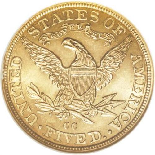 <B>1882-CC $5 MS63 NGC.</B></I> The mintage figure for the 1882-CC half eagle amounts to 82,817 coins, a plentiful amount by the standards of the era and the Carson City Mint. For comparison purposes, the previous and subsequent CC-mint half eagle emissions were 13,886 and 12,598 pieces, respectively--each less than one-sixth as much as the 1882 figure. <BR> Why was such a relatively large number of half eagles produced at Carson City during the year? In the first place, 1881 saw the Carson City Mint presses shut down for most of the year, so that the following year looks overlarge in comparison, and in the second place there were modest increases in gold yields from the nearby Comstock Lode that translated into increased gold coinage. Rusty Goe's <I>The Mint on Carson Street </B></I>notes that most of the 1882-CC half eagles found their way outside of Nevada, and those remaining nearby circulated extensively, leading to a large supply today in Fine to AU. Goe says "Uncirculated specimens, though existing in lower quantities, are more available than any pre-1890-CC date."<BR> Although found fairly often in circulated condition, most 1882-CC half eagles average only AU or so, and the population drops precipitously in Mint State. While there are about three dozen Mint State 1882-CC half eagles at both services combined, as of (8/07) this is <I>the only MS63 example of the date certified at either NGC or PCGS, and there are none finer.</B></I> Jeff Garrett and Ron Guth note that many of the high-grade examples of this date are quite bagmarked, and that appealing examples are rare.<BR> The present example is thus a pleasant surprise on many counts, as it offers extremely pleasing appeal and surfaces that are quite pristine for the grade and mint. The straw-gold surfaces show few distracting contact marks, either large or small, and the bold strike is an added bonus. Radiant luster cascades from each side, and a couple of tiny dark toning spots fail to dampen the appeal.<BR><BR><BR><B>Coin Engraver:</B> Christian Gobrecht<BR><BR><b>Shipping:</b> Coins & Currency (<a target="_blank" href="http://www.heritageauctions.com/common/shipping.php">view shipping information</a>)