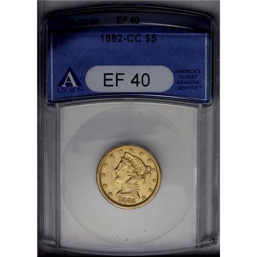 <B>1882-CC<$5> XF40 ANACS.</B></I> Another popular issue from the legendary Nevada mint, always in demand from collectors. This CC-mint issue is more commonly encountered than some others, although scarce in higher grades. Considerable luster remains on this pretty canary-gold piece, although a small planchet lamination is seen near the date. Boldly struck and attractive.