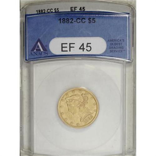 <B>1882-CC $5 XF45 ANACS.</B></I> NGC Census: (43/346). PCGS Population (30/186). Mintage: 82,817. Numismedia Wsl. Price for NGC/PCGS coin in XF45: $561. (#8359)<BR><BR><B>Coin Engraver:</B> Christian Gobrecht<BR><BR><b>Shipping:</b> Coins & Currency (<a target="_blank" href="http://www.heritageauctions.com/common/shipping.php">view shipping information</a>\)