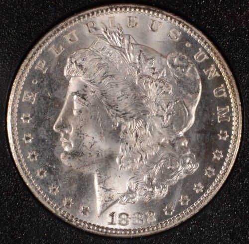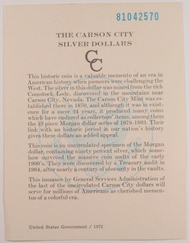 1882-CC GSA MORGAN SILVER DOLLAR, WITH BOX AND COA, MS-64 COLOR