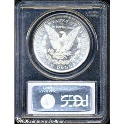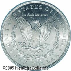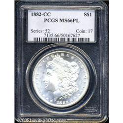 <B>1882-CC<img border='0' src='http://www.heritagecoins.com/images/star.gif' width=10 height=10>$1 MS66 Prooflike PCGS.</B></I> This clean-cheeked and suitably struck premium Gem displays flashy luster and possesses impressive eye appeal. The obverse is well preserved, and only trivial blemishes in the reverse field near the arrowheads deny an even finer grade. Population: 55 in 66 Prooflike, 1 finer (1/05). Lot:10080