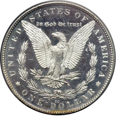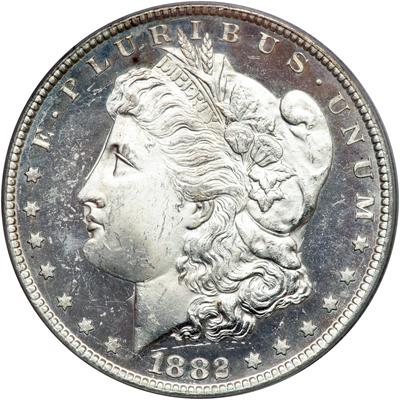 1882-CC Morgan Dollar. PCGS graded MS-65 Deep Mirror Prooflike. Well struck, white, and blazing, the offsetting frosted devices on both sides give this a stunning appearance. Nothing furtive about this one; it is right up front with its dazzling originality. Pop 320; 61 finer, 60 in 66, 1 in 67 (PCGS # 97135).