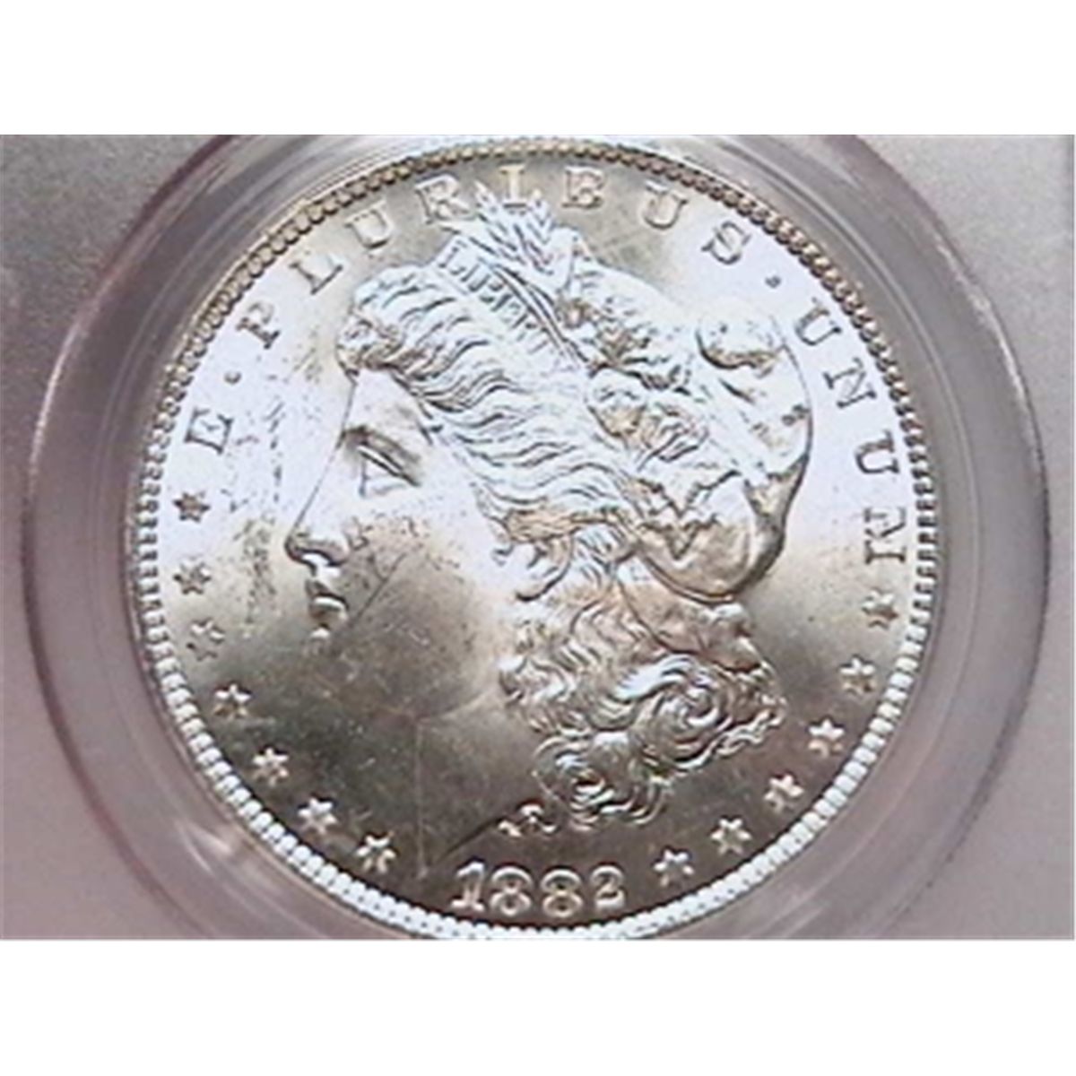 1882-CC Morgan Dollar Ch MS64 PCGS. Frosty white coin. The kind of lustre that the CC dollars from the GSA sale show