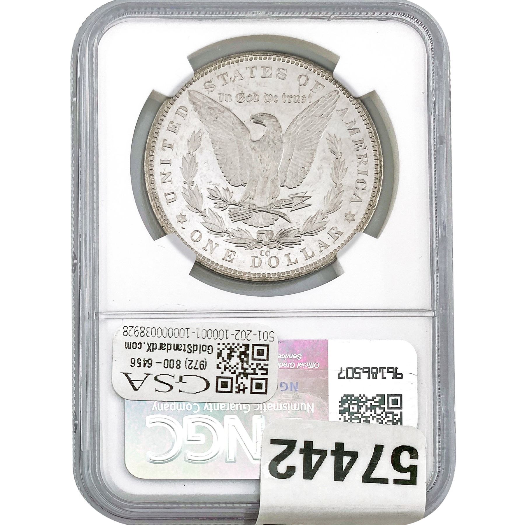 e. Coins sold referencing a third-party grading service are sold “AS IS” without any express or implied warranty, except for a guarantee by GSA that they are genuine. Removal or alteration of the holder, voids all of Bidder’s claims concerning that Product. Certain warranties may be available from the grading services and Bidders are referred to them for further details: Numismatic Guaranty Corporation (NGC), PO Box 4776, Sarasota, FL 34230, www.ngccoin.com/services/writtenguarantee.asp; Professional Coin Grading Services (PCGS), PO Box 9458, Newport Beach, CA 92658, www.pcgs.com/guarantee.html; ANACS, 6555 S. Kenton St., Ste. 303, Englewood, CO 80111; and Independent Coin Grading Co. (ICG), 7901 East Bellview, Ave., Suite 50, Englewood, CO 80111.