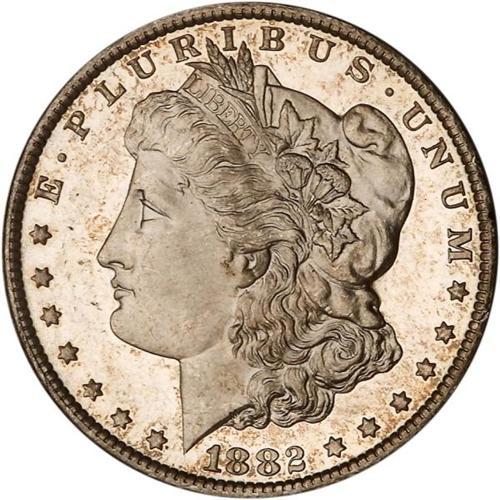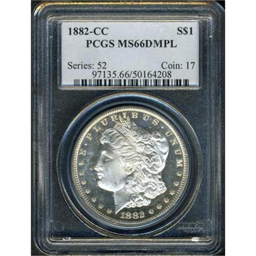 <b>1882-CC Morgan Dollar. PCGS graded MS66 DMPL.</b> Lightly toned. The certified population of this otherwise easily obtainable CC-mint issue dwindles rapidly above the MS65 grade level, and especially in full deep prooflike condition. A solidly graded, premium quality Gem, this coin displays impressive striking definition for any dollar from this branch mint. This is not to say that the strike is razor-sharp, but only a few hair strands over Liberty's ear keep this coin from that designation. The play of the mirror surface against the frosty contrast is beautiful to see <b>(PCGS # 97135)</b>