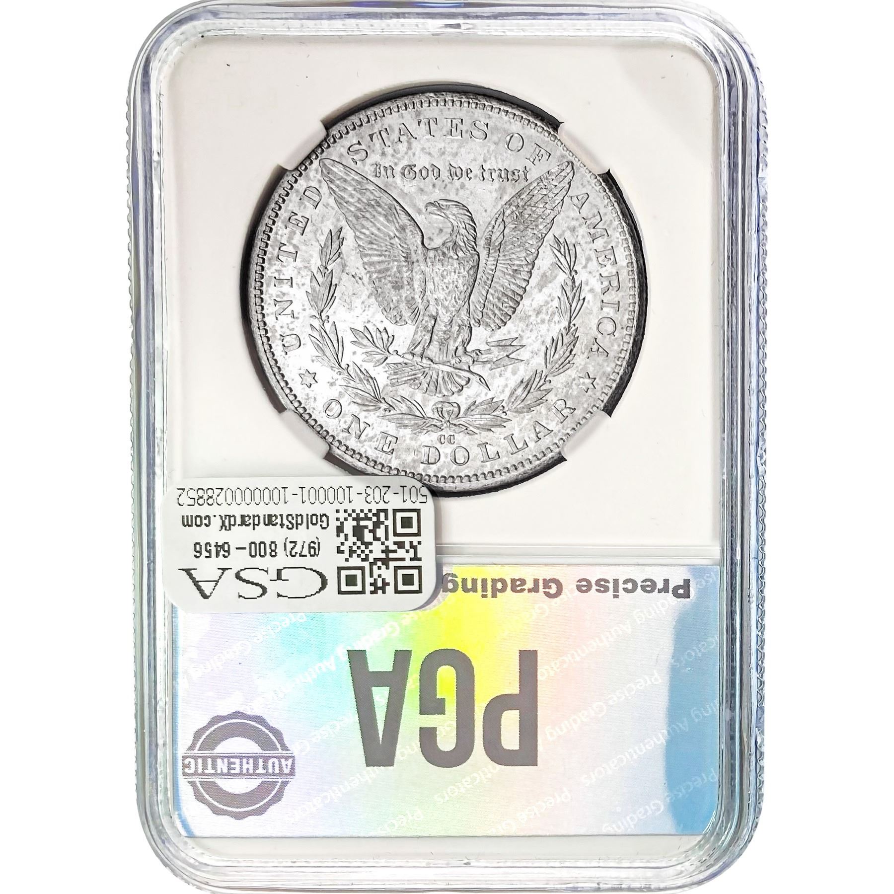 COINS AND CURRENCY LISTED IN GSA’S CATALOG AS GRADED AND ENCAPSULATED BY PCGS, NGC, ANACS, ICG, PCGS CURRENCY, PMG, PCGS BANKNOTE GRADING, CMC OR ANY OTHER THIRD-PARTY GRADING SERVICE ARE LIKEWISE SOLD “AS-IS” EXCEPT AS EXPRESSLY SET FORTH HEREIN. ALL THIRD-PARTY GRADING SERVICE GUARANTEES, INCLUDING AUTHENTICITY, ARE THE SOLE RESPONSIBILITY OF THE THIRD-PARTY GRADING SERVICE AND NOT WARRANTIES OR GUARANTEES OF GSA. BIDDERS SHOULD CONTACT THESE THIRD-PARTY GRADING SERVICES DIRECTLY WITH RESPECT TO ANY CLAIMS OR QUESTIONS THEY MAY HAVE CONCERNING THEIR GUARANTEES AND WARRANTIES. BIDDERS ACKNOWLEDGE AND AGREE THAT AUCTIONEER IS NOT BOUND BY OR LIABLE FOR ANY OPINION OR CERTIFICATION BY ANY THIRD-PARTY GRADING SERVICE. REMOVAL OF A PRODUCT FROM ITS PROTECTIVE CASING OR HOLDER OR ALTERATION OF ANY COIN HOLDER WAIVES ALL RIGHTS CONCERNING THE PRODUCT CONTAINED THEREIN.