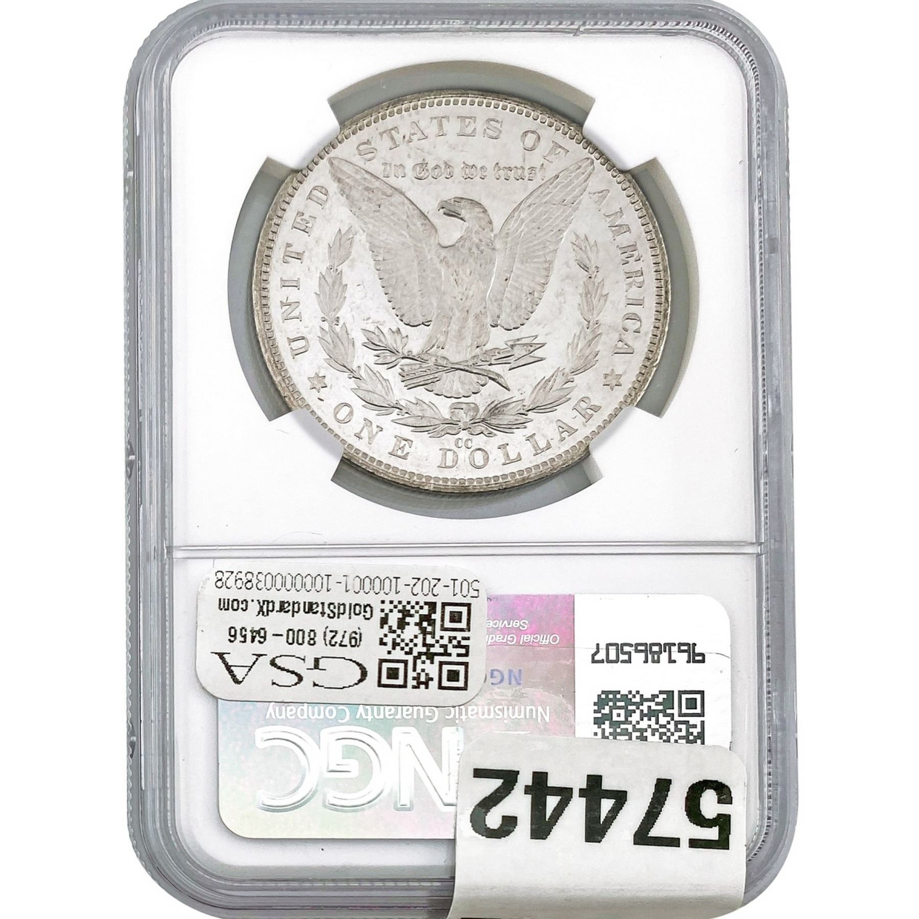 e. Coins sold referencing a third-party grading service are sold “AS IS” without any express or implied warranty, except for a guarantee by GSA that they are genuine. Removal or alteration of the holder, voids all of Bidder’s claims concerning that Product. Certain warranties may be available from the grading services and Bidders are referred to them for further details: Numismatic Guaranty Corporation (NGC), PO Box 4776, Sarasota, FL 34230, www.ngccoin.com/services/writtenguarantee.asp; Professional Coin Grading Services (PCGS), PO Box 9458, Newport Beach, CA 92658, www.pcgs.com/guarantee.html; ANACS, 6555 S. Kenton St., Ste. 303, Englewood, CO 80111; and Independent Coin Grading Co. (ICG), 7901 East Bellview, Ave., Suite 50, Englewood, CO 80111.
