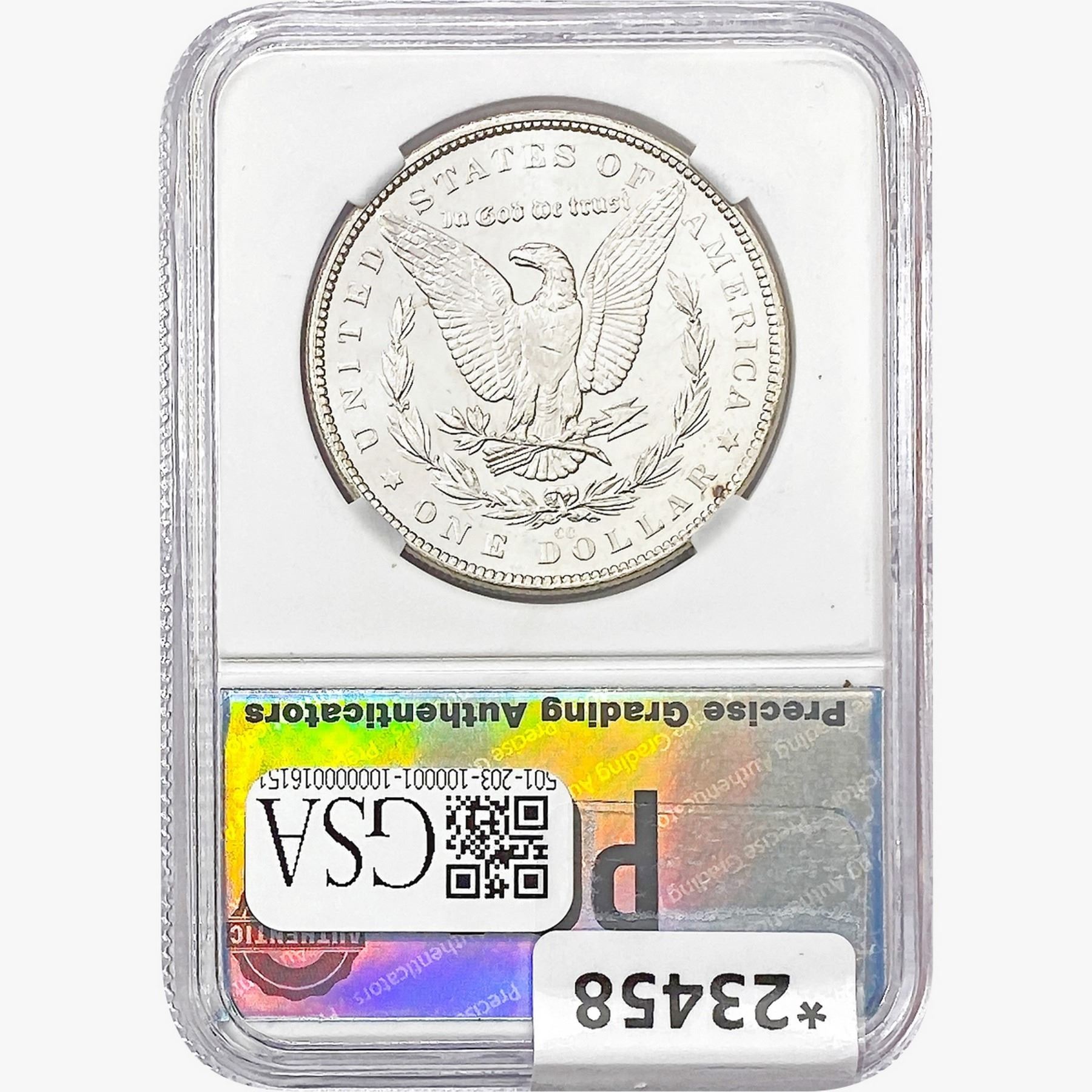 COINS AND CURRENCY LISTED IN GSA’S CATALOG AS GRADED AND ENCAPSULATED BY PCGS, NGC, ANACS, ICG, PCGS CURRENCY, PMG, PCGS BANKNOTE GRADING, CMC OR ANY OTHER THIRD-PARTY GRADING SERVICE ARE LIKEWISE SOLD “AS-IS” EXCEPT AS EXPRESSLY SET FORTH HEREIN. ALL THIRD-PARTY GRADING SERVICE GUARANTEES, INCLUDING AUTHENTICITY, ARE THE SOLE RESPONSIBILITY OF THE THIRD-PARTY GRADING SERVICE AND NOT WARRANTIES OR GUARANTEES OF GSA. BIDDERS SHOULD CONTACT THESE THIRD-PARTY GRADING SERVICES DIRECTLY WITH RESPECT TO ANY CLAIMS OR QUESTIONS THEY MAY HAVE CONCERNING THEIR GUARANTEES AND WARRANTIES. BIDDERS ACKNOWLEDGE AND AGREE THAT AUCTIONEER IS NOT BOUND BY OR LIABLE FOR ANY OPINION OR CERTIFICATION BY ANY THIRD-PARTY GRADING SERVICE. REMOVAL OF A PRODUCT FROM ITS PROTECTIVE CASING OR HOLDER OR ALTERATION OF ANY COIN HOLDER WAIVES ALL RIGHTS CONCERNING THE PRODUCT CONTAINED THEREIN.