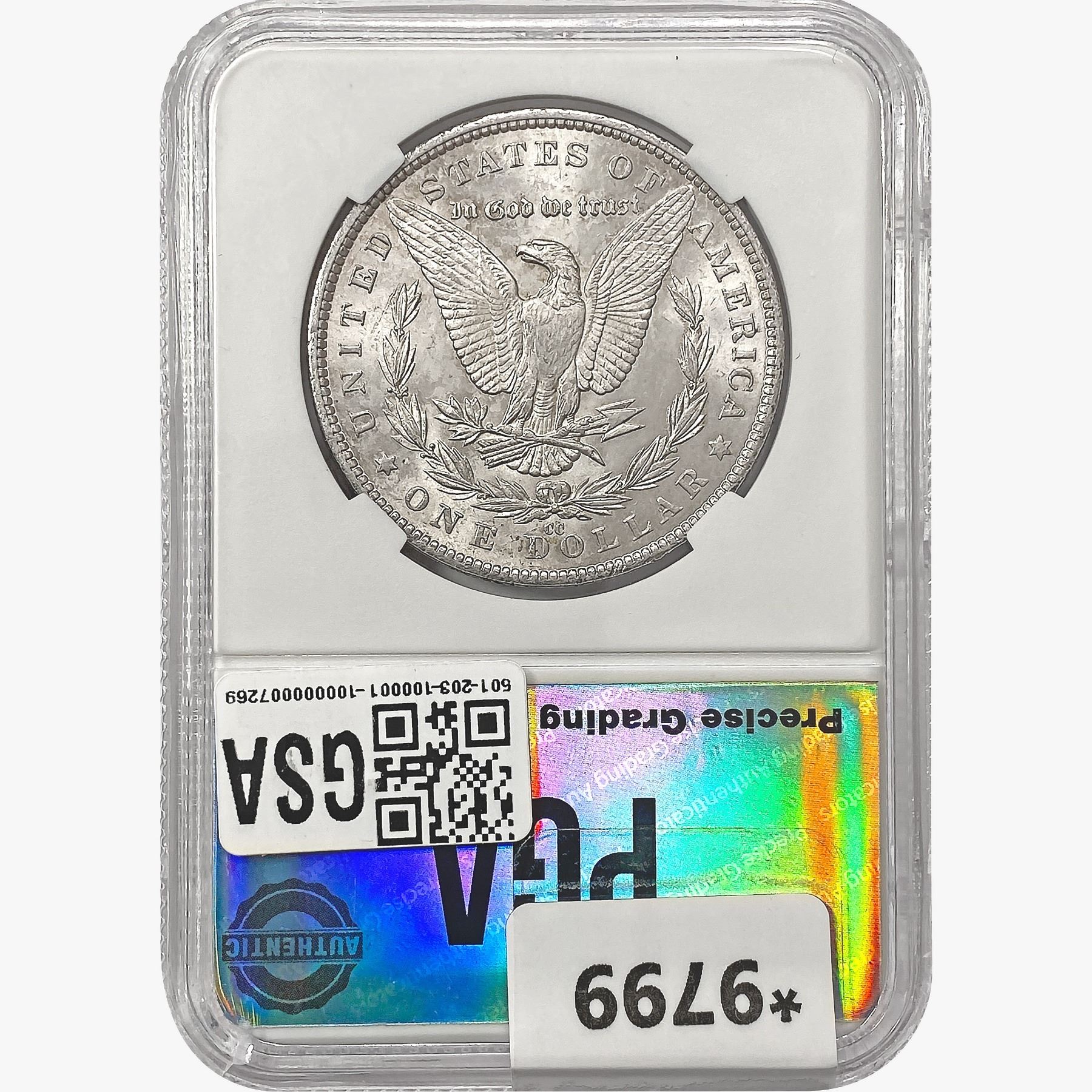 COINS AND CURRENCY LISTED IN GSA’S CATALOG AS GRADED AND ENCAPSULATED BY PCGS, NGC, ANACS, ICG, PCGS CURRENCY, PMG, PCGS BANKNOTE GRADING, CMC OR ANY OTHER THIRD-PARTY GRADING SERVICE ARE LIKEWISE SOLD “AS-IS” EXCEPT AS EXPRESSLY SET FORTH HEREIN. ALL THIRD-PARTY GRADING SERVICE GUARANTEES, INCLUDING AUTHENTICITY, ARE THE SOLE RESPONSIBILITY OF THE THIRD-PARTY GRADING SERVICE AND NOT WARRANTIES OR GUARANTEES OF GSA. BIDDERS SHOULD CONTACT THESE THIRD-PARTY GRADING SERVICES DIRECTLY WITH RESPECT TO ANY CLAIMS OR QUESTIONS THEY MAY HAVE CONCERNING THEIR GUARANTEES AND WARRANTIES. BIDDERS ACKNOWLEDGE AND AGREE THAT AUCTIONEER IS NOT BOUND BY OR LIABLE FOR ANY OPINION OR CERTIFICATION BY ANY THIRD-PARTY GRADING SERVICE. REMOVAL OF A PRODUCT FROM ITS PROTECTIVE CASING OR HOLDER OR ALTERATION OF ANY COIN HOLDER WAIVES ALL RIGHTS CONCERNING THE PRODUCT CONTAINED THEREIN.