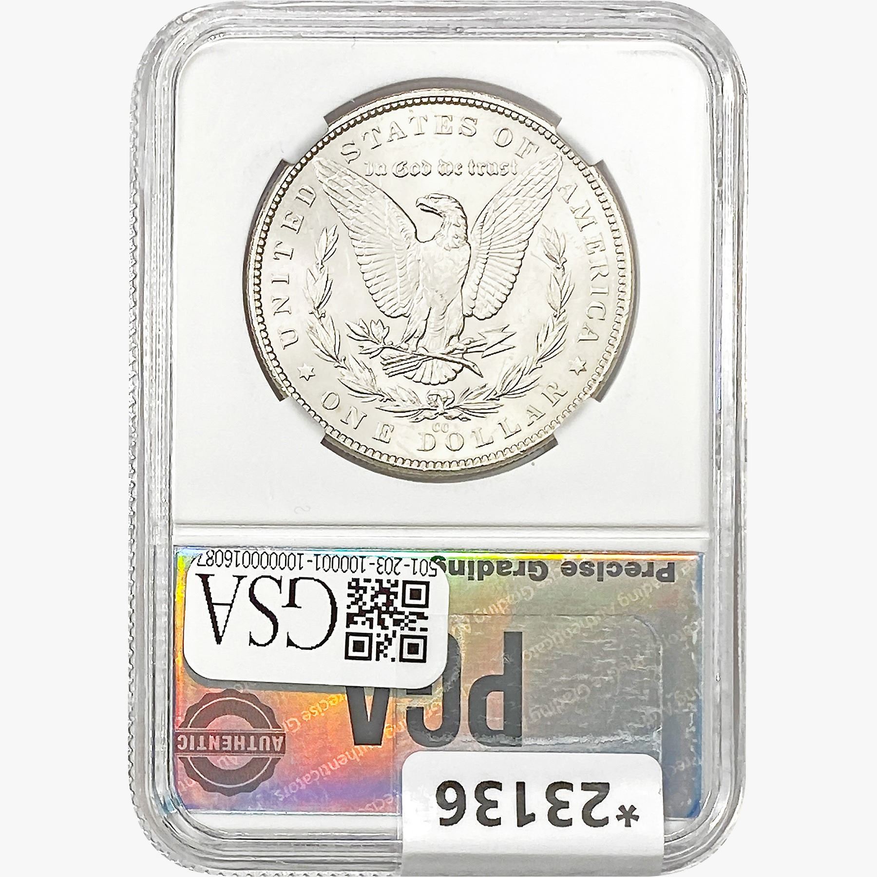 COINS AND CURRENCY LISTED IN GSA’S CATALOG AS GRADED AND ENCAPSULATED BY PCGS, NGC, ANACS, ICG, PCGS CURRENCY, PMG, PCGS BANKNOTE GRADING, CMC OR ANY OTHER THIRD-PARTY GRADING SERVICE ARE LIKEWISE SOLD “AS-IS” EXCEPT AS EXPRESSLY SET FORTH HEREIN. ALL THIRD-PARTY GRADING SERVICE GUARANTEES, INCLUDING AUTHENTICITY, ARE THE SOLE RESPONSIBILITY OF THE THIRD-PARTY GRADING SERVICE AND NOT WARRANTIES OR GUARANTEES OF GSA. BIDDERS SHOULD CONTACT THESE THIRD-PARTY GRADING SERVICES DIRECTLY WITH RESPECT TO ANY CLAIMS OR QUESTIONS THEY MAY HAVE CONCERNING THEIR GUARANTEES AND WARRANTIES. BIDDERS ACKNOWLEDGE AND AGREE THAT AUCTIONEER IS NOT BOUND BY OR LIABLE FOR ANY OPINION OR CERTIFICATION BY ANY THIRD-PARTY GRADING SERVICE. REMOVAL OF A PRODUCT FROM ITS PROTECTIVE CASING OR HOLDER OR ALTERATION OF ANY COIN HOLDER WAIVES ALL RIGHTS CONCERNING THE PRODUCT CONTAINED THEREIN.