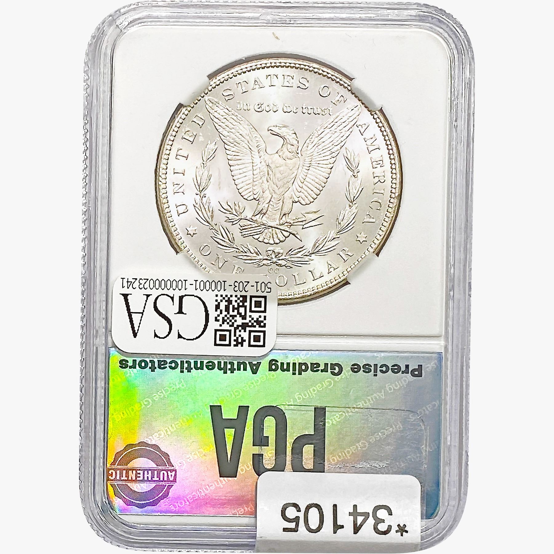COINS AND CURRENCY LISTED IN GSA’S CATALOG AS GRADED AND ENCAPSULATED BY PCGS, NGC, ANACS, ICG, PCGS CURRENCY, PMG, PCGS BANKNOTE GRADING, CMC OR ANY OTHER THIRD-PARTY GRADING SERVICE ARE LIKEWISE SOLD “AS-IS” EXCEPT AS EXPRESSLY SET FORTH HEREIN. ALL THIRD-PARTY GRADING SERVICE GUARANTEES, INCLUDING AUTHENTICITY, ARE THE SOLE RESPONSIBILITY OF THE THIRD-PARTY GRADING SERVICE AND NOT WARRANTIES OR GUARANTEES OF GSA. BIDDERS SHOULD CONTACT THESE THIRD-PARTY GRADING SERVICES DIRECTLY WITH RESPECT TO ANY CLAIMS OR QUESTIONS THEY MAY HAVE CONCERNING THEIR GUARANTEES AND WARRANTIES. BIDDERS ACKNOWLEDGE AND AGREE THAT AUCTIONEER IS NOT BOUND BY OR LIABLE FOR ANY OPINION OR CERTIFICATION BY ANY THIRD-PARTY GRADING SERVICE. REMOVAL OF A PRODUCT FROM ITS PROTECTIVE CASING OR HOLDER OR ALTERATION OF ANY COIN HOLDER WAIVES ALL RIGHTS CONCERNING THE PRODUCT CONTAINED THEREIN.