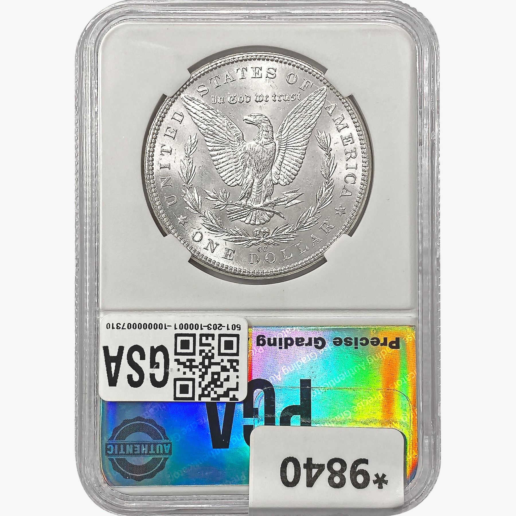 COINS AND CURRENCY LISTED IN GSA’S CATALOG AS GRADED AND ENCAPSULATED BY PCGS, NGC, ANACS, ICG, PCGS CURRENCY, PMG, PCGS BANKNOTE GRADING, CMC OR ANY OTHER THIRD-PARTY GRADING SERVICE ARE LIKEWISE SOLD “AS-IS” EXCEPT AS EXPRESSLY SET FORTH HEREIN. ALL THIRD-PARTY GRADING SERVICE GUARANTEES, INCLUDING AUTHENTICITY, ARE THE SOLE RESPONSIBILITY OF THE THIRD-PARTY GRADING SERVICE AND NOT WARRANTIES OR GUARANTEES OF GSA. BIDDERS SHOULD CONTACT THESE THIRD-PARTY GRADING SERVICES DIRECTLY WITH RESPECT TO ANY CLAIMS OR QUESTIONS THEY MAY HAVE CONCERNING THEIR GUARANTEES AND WARRANTIES. BIDDERS ACKNOWLEDGE AND AGREE THAT AUCTIONEER IS NOT BOUND BY OR LIABLE FOR ANY OPINION OR CERTIFICATION BY ANY THIRD-PARTY GRADING SERVICE. REMOVAL OF A PRODUCT FROM ITS PROTECTIVE CASING OR HOLDER OR ALTERATION OF ANY COIN HOLDER WAIVES ALL RIGHTS CONCERNING THE PRODUCT CONTAINED THEREIN.