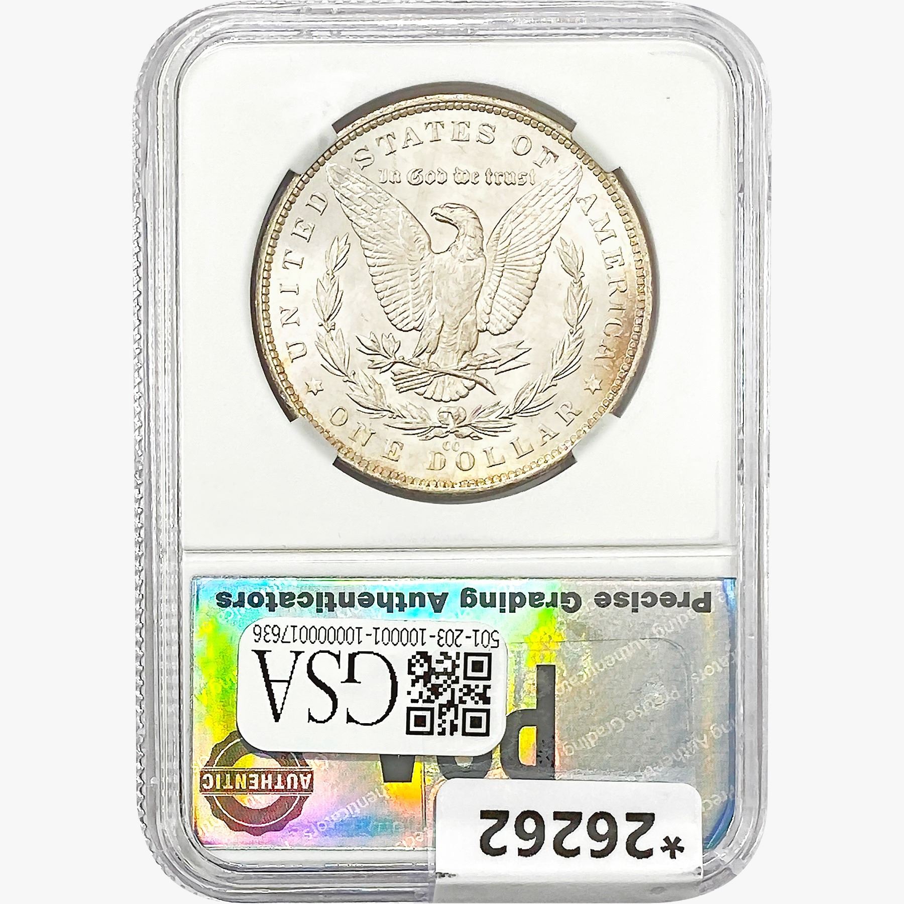COINS AND CURRENCY LISTED IN GSA’S CATALOG AS GRADED AND ENCAPSULATED BY PCGS, NGC, ANACS, ICG, PCGS CURRENCY, PMG, PCGS BANKNOTE GRADING, CMC OR ANY OTHER THIRD-PARTY GRADING SERVICE ARE LIKEWISE SOLD “AS-IS” EXCEPT AS EXPRESSLY SET FORTH HEREIN. ALL THIRD-PARTY GRADING SERVICE GUARANTEES, INCLUDING AUTHENTICITY, ARE THE SOLE RESPONSIBILITY OF THE THIRD-PARTY GRADING SERVICE AND NOT WARRANTIES OR GUARANTEES OF GSA. BIDDERS SHOULD CONTACT THESE THIRD-PARTY GRADING SERVICES DIRECTLY WITH RESPECT TO ANY CLAIMS OR QUESTIONS THEY MAY HAVE CONCERNING THEIR GUARANTEES AND WARRANTIES. BIDDERS ACKNOWLEDGE AND AGREE THAT AUCTIONEER IS NOT BOUND BY OR LIABLE FOR ANY OPINION OR CERTIFICATION BY ANY THIRD-PARTY GRADING SERVICE. REMOVAL OF A PRODUCT FROM ITS PROTECTIVE CASING OR HOLDER OR ALTERATION OF ANY COIN HOLDER WAIVES ALL RIGHTS CONCERNING THE PRODUCT CONTAINED THEREIN.