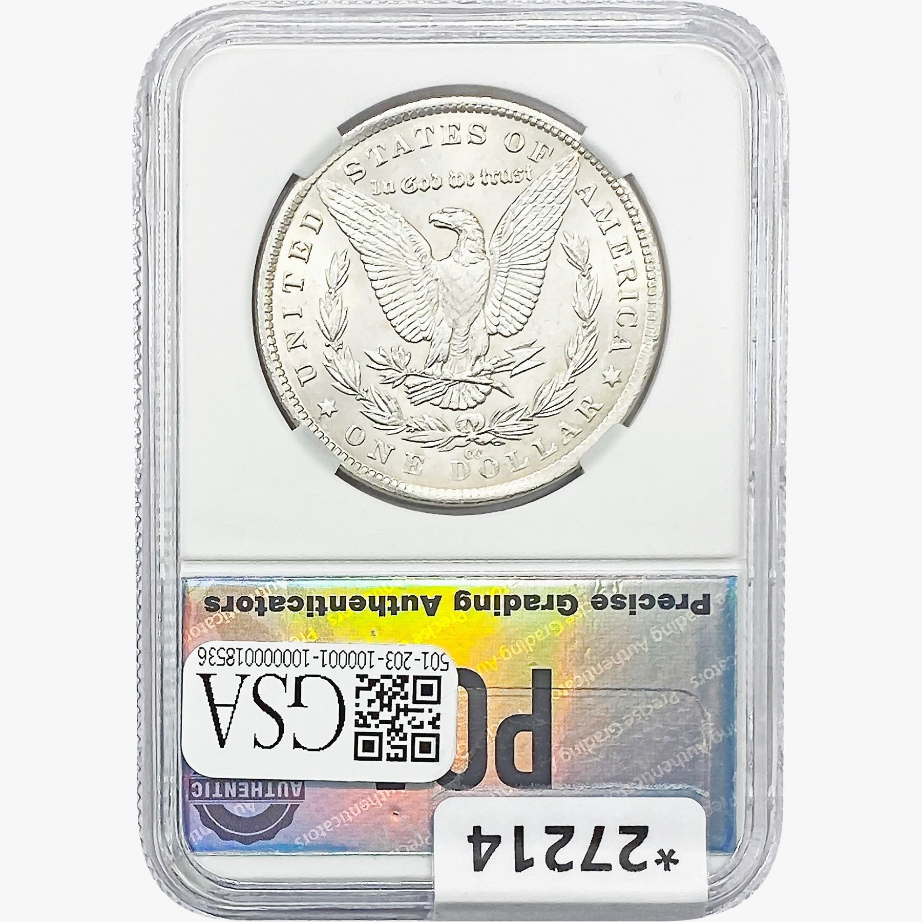 COINS AND CURRENCY LISTED IN GSA’S CATALOG AS GRADED AND ENCAPSULATED BY PCGS, NGC, ANACS, ICG, PCGS CURRENCY, PMG, PCGS BANKNOTE GRADING, CMC OR ANY OTHER THIRD-PARTY GRADING SERVICE ARE LIKEWISE SOLD “AS-IS” EXCEPT AS EXPRESSLY SET FORTH HEREIN. ALL THIRD-PARTY GRADING SERVICE GUARANTEES, INCLUDING AUTHENTICITY, ARE THE SOLE RESPONSIBILITY OF THE THIRD-PARTY GRADING SERVICE AND NOT WARRANTIES OR GUARANTEES OF GSA. BIDDERS SHOULD CONTACT THESE THIRD-PARTY GRADING SERVICES DIRECTLY WITH RESPECT TO ANY CLAIMS OR QUESTIONS THEY MAY HAVE CONCERNING THEIR GUARANTEES AND WARRANTIES. BIDDERS ACKNOWLEDGE AND AGREE THAT AUCTIONEER IS NOT BOUND BY OR LIABLE FOR ANY OPINION OR CERTIFICATION BY ANY THIRD-PARTY GRADING SERVICE. REMOVAL OF A PRODUCT FROM ITS PROTECTIVE CASING OR HOLDER OR ALTERATION OF ANY COIN HOLDER WAIVES ALL RIGHTS CONCERNING THE PRODUCT CONTAINED THEREIN.