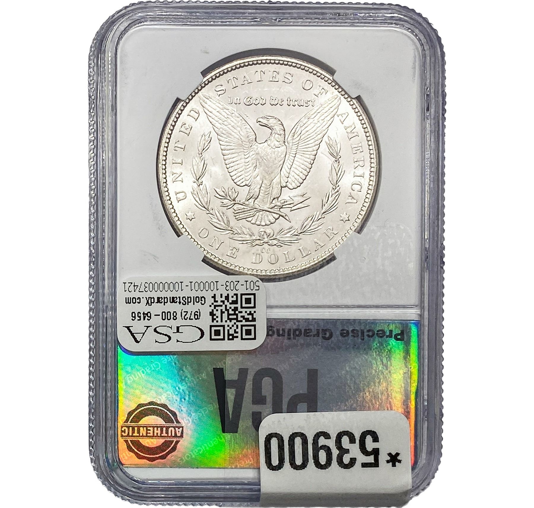 COINS AND CURRENCY LISTED IN GSA’S CATALOG AS GRADED AND ENCAPSULATED BY PCGS, NGC, ANACS, ICG, PCGS CURRENCY, PMG, PCGS BANKNOTE GRADING, CMC OR ANY OTHER THIRD-PARTY GRADING SERVICE ARE LIKEWISE SOLD “AS-IS” EXCEPT AS EXPRESSLY SET FORTH HEREIN. ALL THIRD-PARTY GRADING SERVICE GUARANTEES, INCLUDING AUTHENTICITY, ARE THE SOLE RESPONSIBILITY OF THE THIRD-PARTY GRADING SERVICE AND NOT WARRANTIES OR GUARANTEES OF GSA. BIDDERS SHOULD CONTACT THESE THIRD-PARTY GRADING SERVICES DIRECTLY WITH RESPECT TO ANY CLAIMS OR QUESTIONS THEY MAY HAVE CONCERNING THEIR GUARANTEES AND WARRANTIES. BIDDERS ACKNOWLEDGE AND AGREE THAT AUCTIONEER IS NOT BOUND BY OR LIABLE FOR ANY OPINION OR CERTIFICATION BY ANY THIRD-PARTY GRADING SERVICE. REMOVAL OF A PRODUCT FROM ITS PROTECTIVE CASING OR HOLDER OR ALTERATION OF ANY COIN HOLDER WAIVES ALL RIGHTS CONCERNING THE PRODUCT CONTAINED THEREIN.