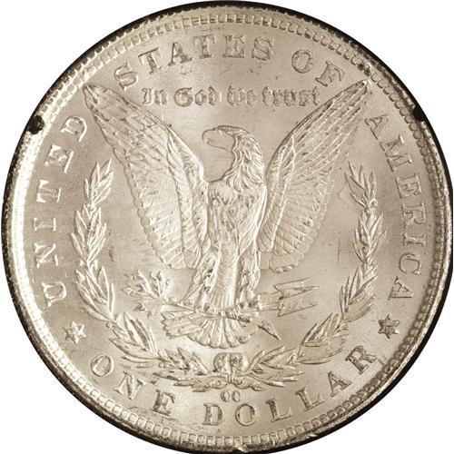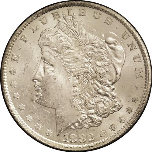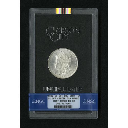 <B>1882-CC<img border='0' src='http://www.heritagecoins.com/images/star.gif' width=10 height=10>$1> GSA Morgan Dollar--Double Struck, 5% Off Center--MS62 NGC.</B></I> VAM-2. This Carson City dollar was struck twice by the dies. The first strike was approximately 5% off center toward 6 o'clock, with the denticles beneath the date absent from the flan. The second strike was presumably a partial collar strike, although the edge is not available for inspection, as the coin remains housed within its black plastic GSA holder of issue. The piece did not eject after its first impression, and no additional planchet entered the coinage chamber. The second strike was well centered between the dies, and there is no rotation relative to the first strike, although the designs are several degrees north of the initial impression. Portions of the date from the first strike are obvious within the denticles beneath the date for the second strike. Diagnostic of a double strike, the eagle's wings and Liberty's profile have a distorted appearance and broad, flat outlines. These flat outlines are design portions from the first strike that were flattened by the second strike. Liberty has two ear lobes, and LIBERTY has a wider shift than seen on any 1878 VAM. Lightly toned and fully lustrous, and these two favorable attributes led to the piece's appearance in the GSA sales of the 1970s. Although slightly out of round due to broad rim at 6 o'clock, the piece nonetheless fits easily within the standard black plastic GSA holder. One can only speculate how the fortunate numismatist recipient of the piece reacted to it upon first sight. The coin has considerable eye appeal given its MS62 grade, since the reverse field is well preserved, and the obverse has only minor grazes on the lower left obverse field and on Liberty's cheek and neck. The only abrasion worthy of singular mention is a thin and mostly vertical scuff on the eagle's body. An NGC Photo Proof accompanies the lot, as does t <BR><BR><B>Important