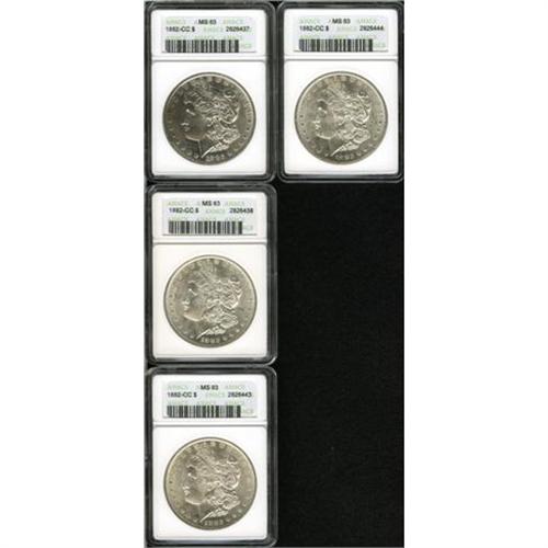 <B>1882-CC<img border='0' src='http://www.heritagecoins.com/images/star.gif' width=10 height=10>$1> MS63 ANACS.</B></I> A nice group of four 1882-CC dollars graded MS63 by ANACS. All four of the coins are bright and mostly white, but a couple of the pieces display a slight degree of toning. Boldly struck, the coins display a typical number of abrasions for the assigned grade level.