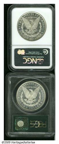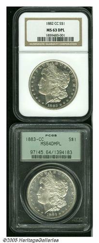 <B>1882-CC<S$1> MS63 Deep Mirror Prooflike NGC,</B></I> and an <B>1883-CC MS64 Deep Mirror Prooflike PCGS,</B></I> the well struck devices on both pieces are nicely highlighted by the deeply mirrored fields.