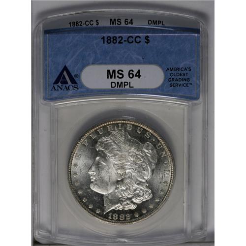<B>1882-CC<img border='0' src='http://www.heritagecoins.com/images/star.gif' width=10 height=10>$1> MS64 Deep Mirror Prooflike ANACS.</B></I> An attractive and well struck near-Gem. This Carson City dollar's virtually untoned surfaces blaze with luster.