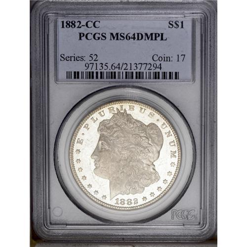 <B>1882-CC<img border='0' src='http://www.heritagecoins.com/images/star.gif' width=10 height=10>$1> MS64 Deep Mirror Prooflike PCGS.</B></I> Well struck with dazzling reflectivity in the deep mirror fields and a slight degree of coral color on the frosted central devices. Wispy luster grazes in the left obverse field prevent a Gem grade assessment. <BR><BR><B>Important notice:</B> Heritage usually auctions material at the rate of 200-250 lots per hour. On some occasions eBay Live bid software or the Internet may not be able to keep up with the pace of the auction. We recommend placing a realistic absentee bid now as insurance to avoid disappointment. Occasionally the auctioneer may eliminate or reject an eBay Live bid, and the auctioneer may also reopen a lot after the close of the eBay live bidding (usually because we missed an audience bid), and may reject your bid even if it shows you as the winning bidder. By bidding via eBay Live, you agree that Heritage may award the lot to another bidder at its sole discretion under the circumstances described above or any other reasonable circumstances. Since eBay bids are not shown to us until we open the lot on the floor, we treat those bids just like floor bids. In most cases the floor responds before the eBay bid is presented to us, due to Internet lag time, so for consistency we have made it a policy that floor bids are always considered first over tie eBay live bids. Also please note that all Heritage lots purchased through eBay Live carry a 20% Buyer's Premium. Please make sure you read the Terms and Conditions before you bid. This lot is being auctioned in conjunction with a live floor auction by Heritage Galleries & Auctioneers. All final auction and invoice information will be supplied by Heritage Galleries & Auctioneers, and all other information should be considered preliminary. Lot:3347 <BR><BR><B>Winning Notification and Billing:</B> After the FINAL session in this auction is complete, Heritage will send e-mail and snail mail invoices. This process normally takes several days. All final auction and invoice information will be supplied by Heritage Galleries & Auctioneers, and all other information should be considered preliminary. <BR><BR>This auction will be conducted on a live auction floor and over the Internet through eBay Live. If you choose to place an absentee bid, please take a moment to <font color='#0000ff'><u><a href='http://pages.ebay.com/liveauctions/help/before/laabsentee.html'>learn how eBay Live absentee bidding works</a></u></font><font color='#000000'>