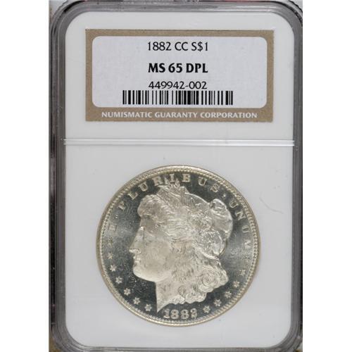 <B>1882-CC S$1 MS65 Deep Mirror Prooflike NGC.</B></I> Wisps of light tan-gold color visit each side of this razor-sharp Gem, and excellent field-motif contrast heightens the eye appeal. A few trivial marks define the grade. Census: 80 in 65 Deep Mirror Prooflike, 4 finer (2/07).<BR><BR><b>Shipping:</b> Coins & Currency (<a target="_blank" href="http://www.heritageauctions.com/common/shipping.php">view shipping information</a>)