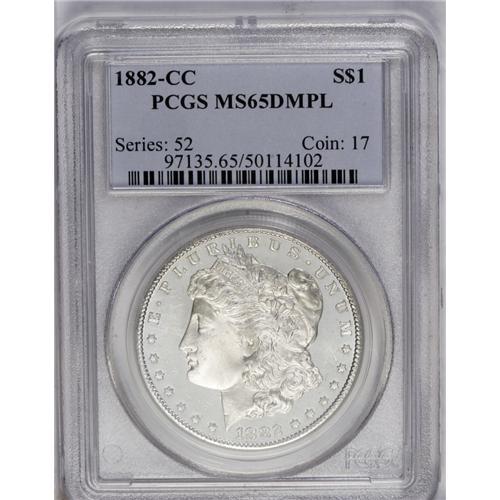 <B>1882-CC<img border='0' src='http://www.heritagecoins.com/images/star.gif' width=10 height=10>$1> MS65 Deep Mirror Prooflike PCGS.</B></I> A flashy example with frosted devices and watery mirrors. Well struck with faint, hazy toning and minimal abrasions.