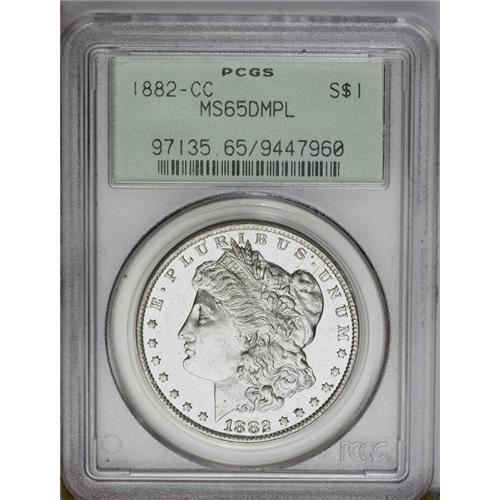 <B>1882-CC<img border='0' src='http://www.heritagecoins.com/images/star.gif' width=10 height=10>$1> MS65 Deep Mirror Prooflike PCGS.</B></I> An essentially brilliant Gem whose flashy fields are remarkably clean. Even the cheek shows only trivial contact. The well struck devices are lightly frosted and provide mild cameo contrast. Encapsulated in a green label holder.