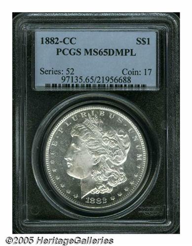 <B>1882-CC<S$1> MS65 Deep Mirror Prooflike PCGS.</B></I> Brilliant white with a near-flawless strike. The minimally marked surfaces are further enhanced by frosted devices providing nice cameo contrast with the mirrored fields.
