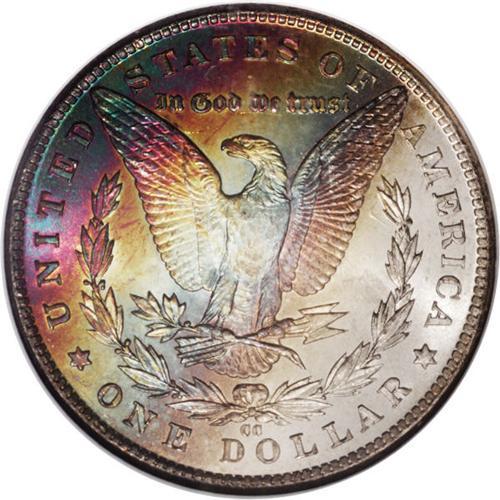 <B>1882-CC<img border='0' src='http://www.heritagecoins.com/images/star.gif' width=10 height=10>$1> MS65 <img border='0' src='http://www.heritagecoins.com/images/star.gif' width=10 height=10> NGC.</B></I> The reverse is placed face-out in the NGC <img border='0' src='http://www.heritagecoins.com/images/star.gif' width=10 height=10> holder to accentuate the colorful bands of antique-gold, sky-blue, mauve, magenta, and jade-green that decorated that side. The obverse is brilliant and completely snow-white. Well defined overall with no mentionable distractions. A remarkably toned example of this ever-popular CC date.