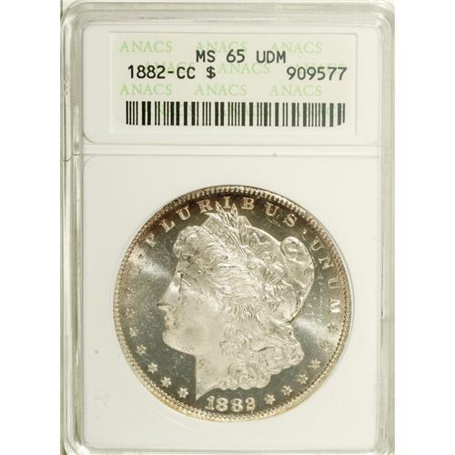 <B>1882-CC S$1 MS65 Ultra Deep Mirror Prooflike ANACS.</B></I> Spectacularly mirrored fields and icy devices combine for outstanding eye appeal. Light plum toning near the rims contributes further to the aesthetic quality. A pair of thin marks are concealed on the eagle's right (facing) wing.<BR><BR><b>Shipping:</b> Coins & Currency (<a target="_blank" href="http://www.heritageauctions.com/common/shipping.php">view shipping information</a>)