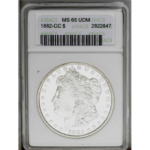 <B>1882-CC<img border='0' src='http://www.heritagecoins.com/images/star.gif' width=10 height=10>$1> MS65 Ultra Deep Mirror Prooflike ANACS.</B></I> The profoundly mirrored fields demonstrate dramatic contrast with the frosty and well struck devices. A splendid Carson City Gem. <BR><BR><B>Important notice:</B> Heritage usually auctions material at the rate of 200-250 lots per hour. On some occasions eBay Live bid software or the Internet may not be able to keep up with the pace of the auction. We recommend placing a realistic absentee bid now as insurance to avoid disappointment. Occasionally the auctioneer may eliminate or reject an eBay Live bid, and the auctioneer may also reopen a lot after the close of the eBay live bidding (usually because we missed an audience bid), and may reject your bid even if it shows you as the winning bidder. By bidding via eBay Live, you agree that Heritage may award the lot to another bidder at its sole discretion under the circumstances described above or any other reasonable circumstances. Since eBay bids are not shown to us until we open the lot on the floor, we treat those bids just like floor bids. In most cases the floor responds before the eBay bid is presented to us, due to Internet lag time, so for consistency we have made it a policy that floor bids are always considered first over tie eBay live bids. Also please note that all Heritage lots purchased through eBay Live carry a 20% Buyer's Premium. Please make sure you read the Terms and Conditions before you bid. This lot is being auctioned in conjunction with a live floor auction by Heritage Galleries & Auctioneers. All final auction and invoice information will be supplied by Heritage Galleries & Auctioneers, and all other information should be considered preliminary. Lot:3349 <BR><BR><B>Winning Notification and Billing:</B> After the FINAL session in this auction is complete, Heritage will send e-mail and snail mail invoices. This process normally takes several days. All final auction and invoice information will be supplied by Heritage Galleries & Auctioneers, and all other information should be considered preliminary. <BR><BR>This auction will be conducted on a live auction floor and over the Internet through eBay Live. If you choose to place an absentee bid, please take a moment to <font color='#0000ff'><u><a href='http://pages.ebay.com/liveauctions/help/before/laabsentee.html'>learn how eBay Live absentee bidding works</a></u></font><font color='#000000'>