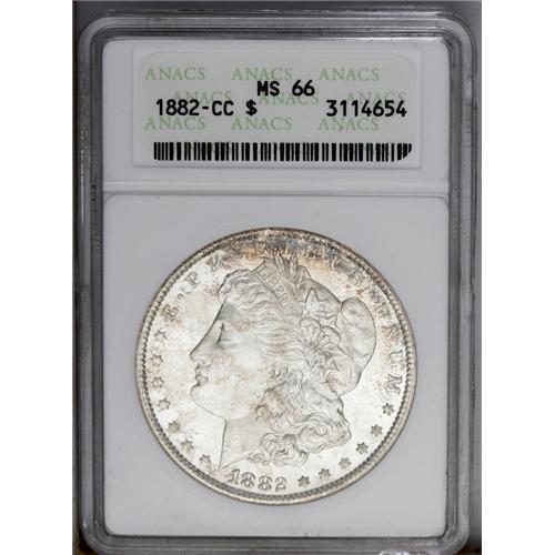 <B>1882-CC<img border='0' src='http://www.heritagecoins.com/images/star.gif' width=10 height=10>$1> MS66 ANACS.</B></I> Blushes of tan and ocean-blue color enrich this sharply struck and somewhat prooflike Gem. The reverse field is nearly free from contact, while the obverse reveals a few light marks. A small rim bruise is also seen at 12:00 on the obverse and reverse. <BR><BR><B>Important notice:</B> Heritage usually auctions material at the rate of 200-250 lots per hour. On some occasions eBay Live bid software or the Internet may not be able to keep up with the pace of the auction. We recommend placing a realistic absentee bid now as insurance to avoid disappointment. Occasionally the auctioneer may eliminate or reject an eBay Live bid, and the auctioneer may also reopen a lot after the close of the eBay live bidding (usually because we missed an audience bid), and may reject your bid even if it shows you as the winning bidder. By bidding via eBay Live, you agree that Heritage may award the lot to another bidder at its sole discretion under the circumstances described above or any other reasonable circumstances. Since eBay bids are not shown to us until we open the lot on the floor, we treat those bids just like floor bids. In most cases the floor responds before the eBay bid is presented to us, due to Internet lag time, so for consistency we have made it a policy that floor bids are always considered first over tie eBay live bids. Also please note that all Heritage lots purchased through eBay Live carry a 20% Buyer's Premium. Please make sure you read the Terms and Conditions before you bid. This lot is being auctioned in conjunction with a live floor auction by Heritage Galleries & Auctioneers. All final auction and invoice information will be supplied by Heritage Galleries & Auctioneers, and all other information should be considered preliminary. Lot:3343 <BR><BR><B>Winning Notification and Billing:</B> After the FINAL session in this auction is complete, Heritage will send e-mail and snail mail invoices. This process normally takes several days. All final auction and invoice information will be supplied by Heritage Galleries & Auctioneers, and all other information should be considered preliminary. <BR><BR>This auction will be conducted on a live auction floor and over the Internet through eBay Live. If you choose to place an absentee bid, please take a moment to <font color='#0000ff'><u><a href='http://pages.ebay.com/liveauctions/help/before/laabsentee.html'>learn how eBay Live absentee bidding works</a></u></font><font color='#000000'>