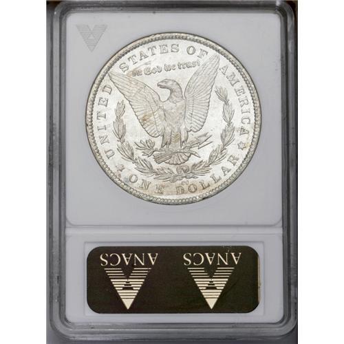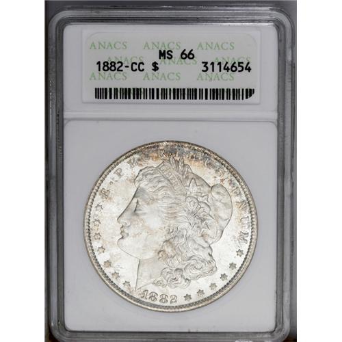 <B>1882-CC<img border='0' src='http://www.heritagecoins.com/images/star.gif' width=10 height=10>$1> MS66 ANACS.</B></I> Blushes of tan and ocean-blue color enrich this sharply struck and somewhat prooflike Gem. The reverse field is nearly free from contact, while the obverse reveals a few light marks. A small rim bruise is also seen at 12:00 on the obverse and reverse.