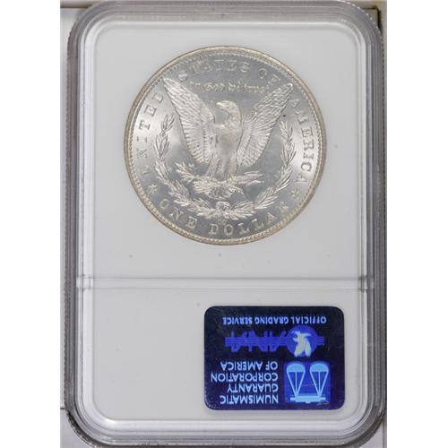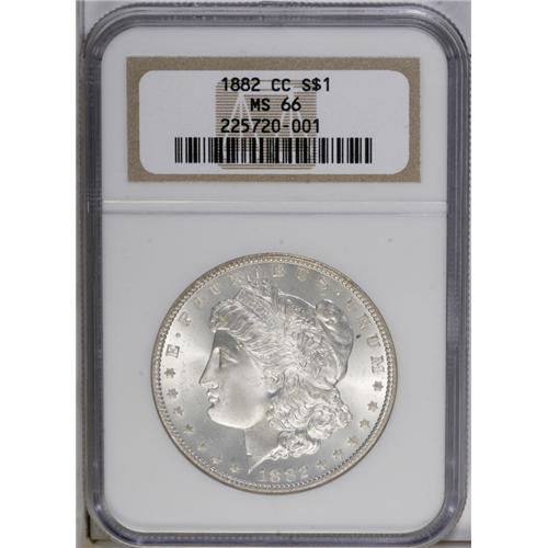 <B>1882-CC<img border='0' src='http://www.heritagecoins.com/images/star.gif' width=10 height=10>$1> MS66 NGC.</B></I> A boldly struck piece with strong luster. The surfaces are mostly untoned with small dark spots on each side and hints of gold at the periphery.