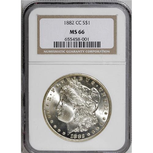 <B>1882-CC<img border='0' src='http://www.heritagecoins.com/images/star.gif' width=10 height=10>$1> MS66 NGC.</B></I> Whispers of tan-gold appear on the highly lustrous surfaces and sharp definition prevails throughout the design features. A few inconsequential luster grazes are present on either side.