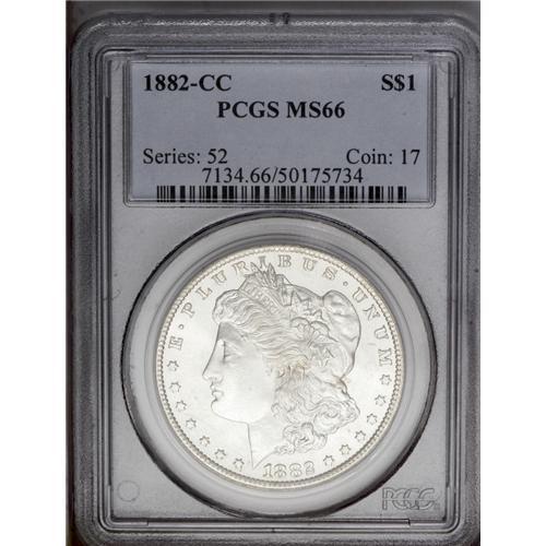 <B>1882-CC<img border='0' src='http://www.heritagecoins.com/images/star.gif' width=10 height=10>$1> MS66 PCGS.</B></I> A lovely example with sharp design motifs, frosty luster, and brilliant silver surfaces on both sides. Although a common date, this issue is not seen with the same frequency as 1883-CC or 1884-CC dollars.
