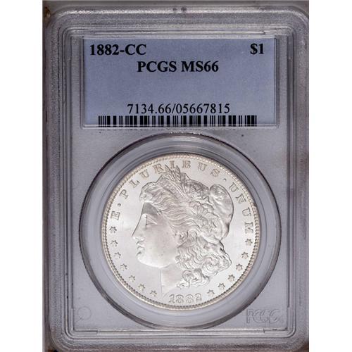 <B>1882-CC<img border='0' src='http://www.heritagecoins.com/images/star.gif' width=10 height=10>$1> MS66 PCGS.</B></I> Bright luster covers both sides of this sharply struck Premium Gem. A wisp or two of light tan- color is seen with magnification. Well preserved throughout.