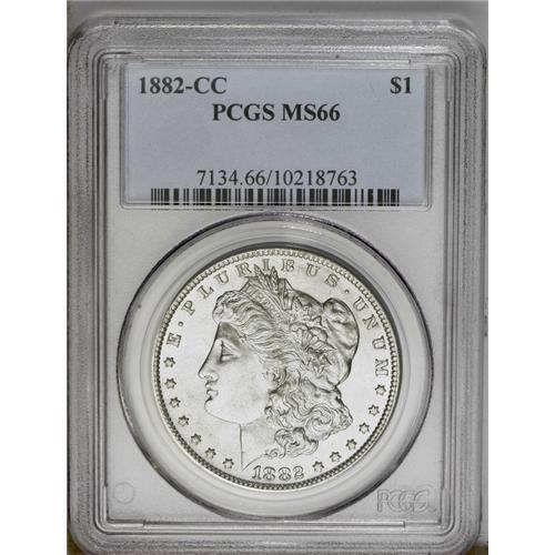 <B>1882-CC<img border='0' src='http://www.heritagecoins.com/images/star.gif' width=10 height=10>$1> MS66 PCGS.</B></I> Potent luster radiates from untoned, well preserved surfaces. The design features are well brought up, including nice definition in the hair over Liberty's ear.