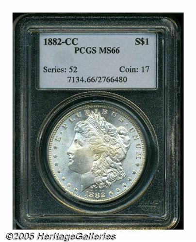 <B>1882-CC<S$1> MS66 PCGS.</B></I> Sharply detailed with scintillating mint brilliance and only a few wispy facial blemishes. Traces of light tan color are noted on the Liberty and eagle motifs. PCGS and NGC combined have certified 70 pieces finer (5/05).